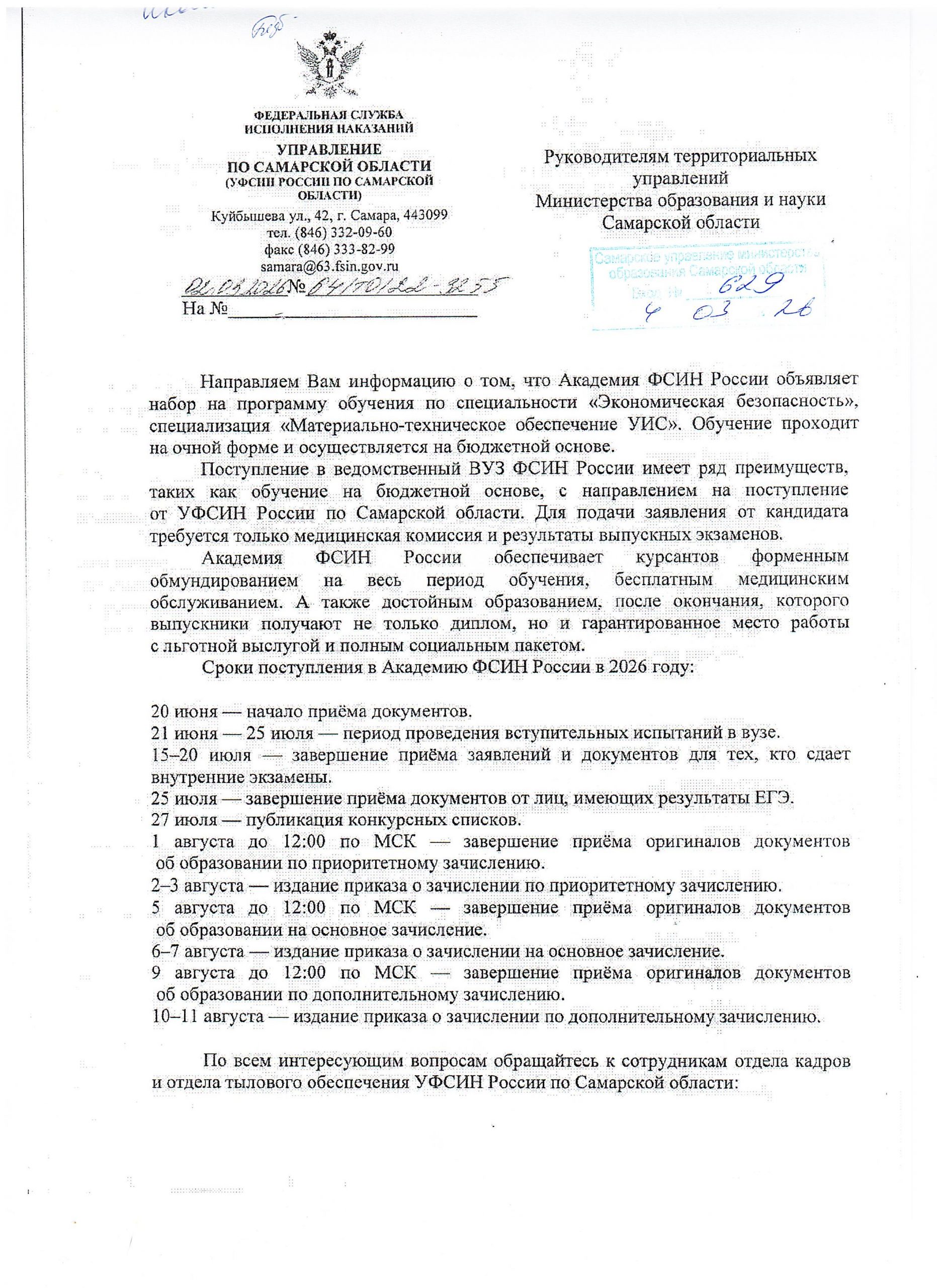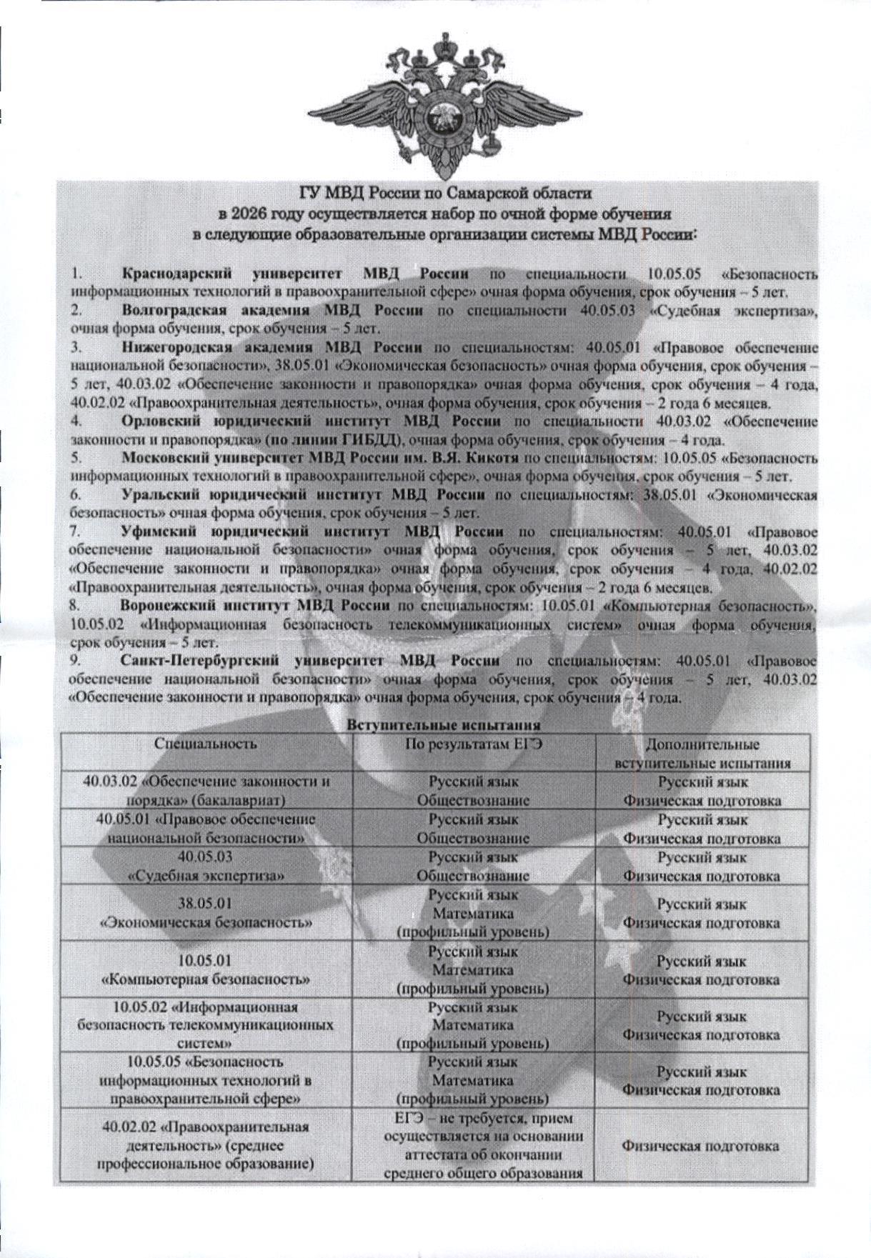 ГУ МВД России по Самарской области в 2023 году осуществляется набор по очной форме обучения в следующие образовательные организации системы МВД России